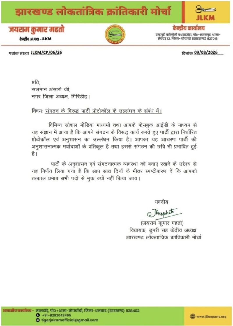 संगठन के विरुद्ध पार्टी प्रोटोकॉल के उल्लंघन मामले को लेकर JLKM के जिला नगर अध्यक्ष को स्पष्टीकरण मांगा गया है। इस संबंध में JLKM के केंद्रीय अध्यक्ष सह डुमरी विधायक जयराम कुमार महतो ने एक पत्र जारी किया है। पत्र में कहा गया कि गिरिडीह के नगर जिला अध्यक्ष सलमान अंसारी के बारे में विभिन्न सोशल मीडिया माध्यमों तथा फेसबुक आईडी के माध्यम से मामला संज्ञान में आया है कि उनके द्वारा संगठन के विरुद्ध कार्य किया गया है। साथ ही पार्टी द्वारा निर्धारित प्रोटोकॉल एवं अनुशासन का उल्लंघन किया है।कहा गया कि उनका आचरण पार्टी की अनुशासनात्मक मर्यादाओं के प्रतिकूल है तथा इससे संगठन की छवि भी प्रभावित हुई है। अनुशासन एवं संगठनात्मक व्यवस्था को बनाए रखने के उद्देश्य से सात दिनों के भीतर स्पष्टीकरण देने का आदेश दिया गया है।