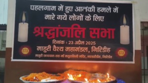 गिरिडीह के भंडारीडीह स्थित माहुरी छात्रावास सह माँ मथुरासिनी मंदिर परिसर में कश्मीर के पहलगाम में हुए आतंकी हमले में मारे गए लोगों की आत्मा की शांति के लिए श्रद्धांजलि सभा का आयोजन किया गया। इस दौरान कैडिल जलाकर पुष्प अर्पित किए गए और दो मिनट का मौन रखा गया।