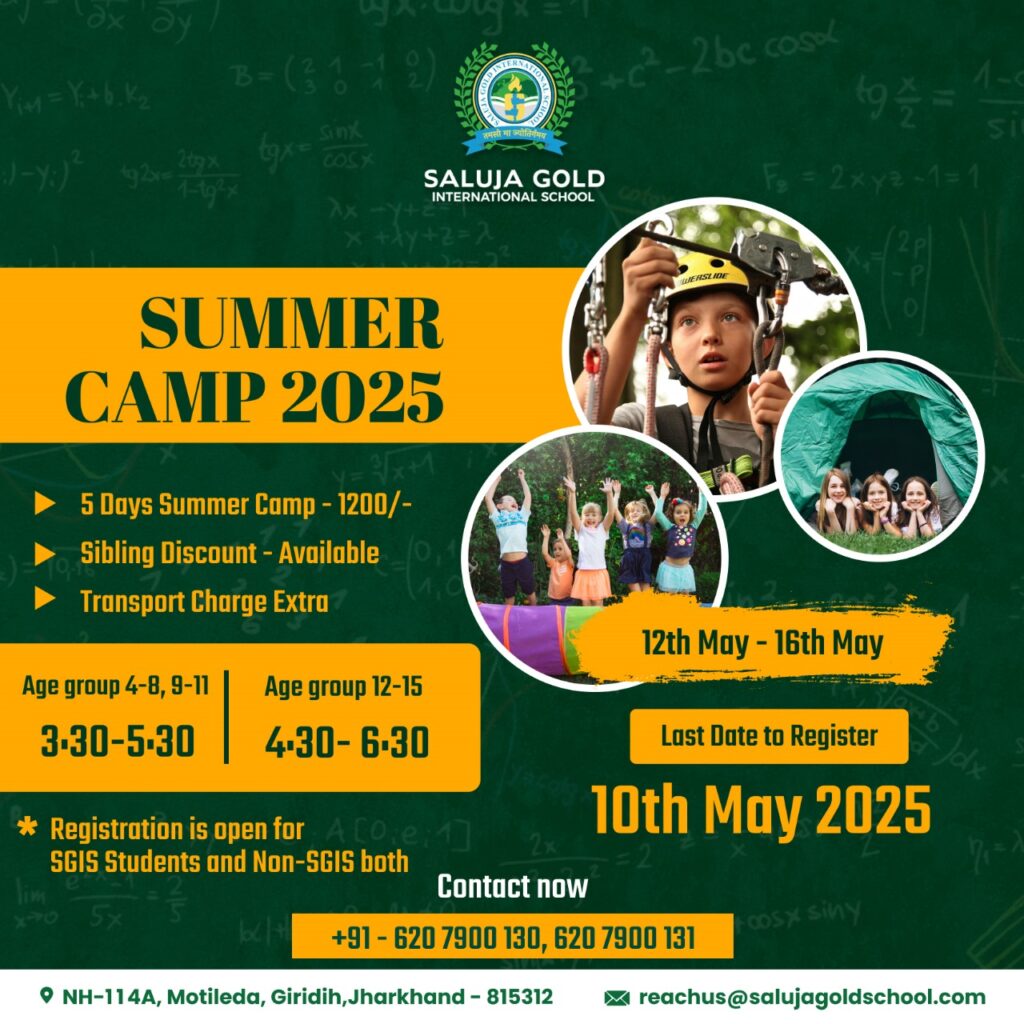 सालुजा गोल्ड इंटरनेशनल स्कूल में समर कैंप 2025 की शुरुआत 12 मई से 16 मई तक होने जा रही है, जहां बच्चों को मिलेगा पाँच दिन का मनोरंजन, शिक्षा और यादगार अनुभवों से भरपूर समय। यह कैंप SGIS और गैर-SGIS दोनों छात्रों के लिए खुला है। रजिस्ट्रेशन प्रक्रिया शुरू हो चुकी है और अंतिम तिथि 10 मई है — सीटें सीमित हैं, तो जल्दी करें! रजिस्ट्रेशन के लिए क्लिक करें: https://shorturl.at/CFTtg