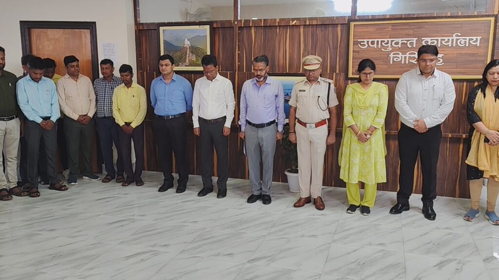 झारखंड के पूर्व मुख्यमंत्री और आदिवासी समाज की मज़बूत आवाज़ दिशोम गुरु शिबू सोरेन के निधन पर 4 अगस्त को गिरिडीह समाहरणालय में शोक सभा आयोजित की गई। जिला उपायुक्त रामनिवास यादव की अध्यक्षता में अधिकारियों और कर्मियों ने दो मिनट का मौन रखकर दिवंगत आत्मा को श्रद्धांजलि दी।