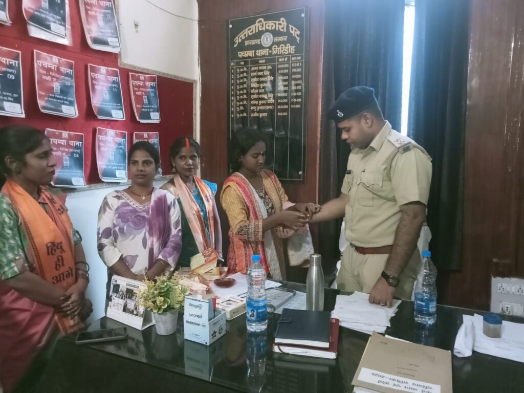 गिरिडीह अंतरराष्ट्रीय हिंदू परिषद की राष्ट्रीय महिला परिषद एवं ओजश्वीनी की ओर से आज रक्षाबंधन का पर्व खास अंदाज में मनाया गया। परिषद की महिला सदस्यों ने मुफ्फसिल थाना और पंचंबा थाना पहुंचकर वहां तैनात पुलिस पदाधिकारियों और जवानों को राखी बांधी और उनके कर्तव्यों को सम्मान देते हुए सुरक्षा का संकल्प लिया। इस अवसर पर परिषद की राष्ट्रीय महिला अध्यक्षा पूनम सिन्हा ने कहा कि यह राखी केवल धागा नहीं, बल्कि समाज की तरफ से प्यार, सम्मान और विश्वास की डोरी है।