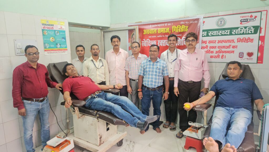 गिरिडीह के अग्रवाल समाज ने स्वैच्छिक रक्तदान शिविर का आयोजन कर मानवता की मिसाल पेश की। गिरिडीह ब्लड सेंटर में आयोजित इस शिविर में समाज के 17 सदस्यों ने रक्तदान किया, जबकि रांची के एएसपी अजय कुमार ने बोकारो में रक्तदान कर इस अभियान में योगदान दिया। बिपिन अग्रवाल ने रक्तदान कर शिविर की शुरुआत की, जिसके बाद प्रमोद अग्रवाल, अनिल अग्रवाल, सौरव अग्रवाल, रोहित अग्रवाल, दिलीप अग्रवाल, विकास अग्रवाल, मिथुन अग्रवाल समेत कई सदस्य इस नेक कार्य में शामिल हुए। नीरज, मंटू, रोहित व संतोष अग्रवाल ने पहली बार रक्तदान कर समाज को प्रेरित किया।