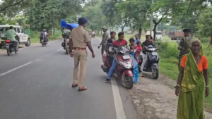 गिरिडीह-डुमरी मुख्य मार्ग पर सोमवार को मुफ्फसिल थाना के पास पुलिस ने विशेष वाहन चेकिंग अभियान चलाया। इस अभियान का नेतृत्व डीएसपी-2 कौशर अली ने किया, वहीं एसआई एतवा खेस, अब्दुल मनान, विकाश कुमार समेत कई पुलिस अधिकारी और जवान भी मौजूद थे। चेकिंग के दौरान पुलिस ने खासतौर पर बिना हेलमेट और ट्रिपल लोड बाइक चालकों पर कार्रवाई की। मौके पर कई वाहन रोके गए और नियम तोड़ने वालों पर जुर्माना लगाया गया।