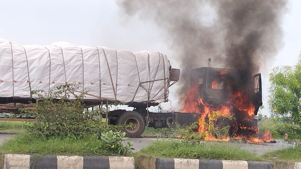 गिरिडीह जिले के बगोदर थाना क्षेत्र अंतर्गत कुलगो टोल प्लाजा के समीप एनएच पर उस वक्त अफरा-तफरी मच गई जब सड़क किनारे खड़ी एक चावल लदी ट्रेलर अचानक आग की चपेट में आ गई। प्रत्यक्षदर्शियों के अनुसार ट्रेलर से धुआं और लपटें उठती देख लोग मौके पर जुटे और तुरंत पुलिस को सूचना दी। खबर मिलते ही बगोदर थाना पुलिस दल-बल के साथ पहुंची और दमकल विभाग को बुलाया, लेकिन तब तक आग ने विकराल रूप ले लिया था और देखते ही देखते पूरा ट्रेलर धुं-धुं कर जल गया। गनीमत रही कि चालक और खलासी सुरक्षित बच निकले, अन्यथा बड़ी जनहानि हो सकती थी। आग लगने के कारणों की जांच की जा रही है, हालांकि प्रारंभिक अनुमान शॉर्ट सर्किट की ओर इशारा कर रहा है। इस हादसे में ट्रेलर और उसमें लदा चावल पूरी तरह जलकर खाक हो गया, जिससे लाखों का नुकसान हुआ है।