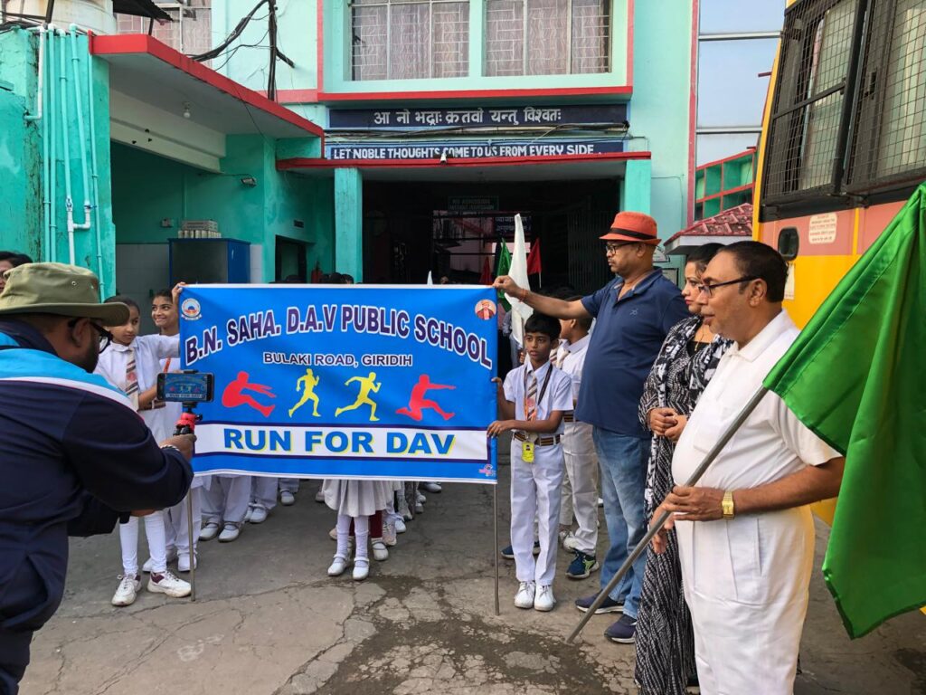 गिरिडीह के बुलाकी रोड स्थित बी.एन.एस. डी.ए.वी. पब्लिक स्कूल में गांधी जयंती के अवसर पर रविवार को आयोजित “Run for DAV” कार्यक्रम ने विद्यार्थियों में जोश और ऊर्जा की नई लहर भर दी। इस आयोजन का शुभारंभ स्कूल के प्रधानाचार्य श्री योगेश्वर शर्मा ने हरी झंडी दिखाकर किया। बच्चों में फिटनेस और एकता की भावना जागृत करने के उद्देश्य से आयोजित इस रन ने पूरे विद्यालय में स्वस्थ जीवनशैली और टीम स्पिरिट का अद्भुत संदेश दिया।