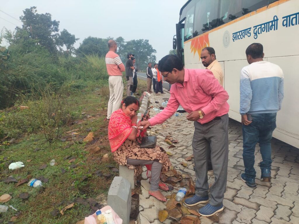 गिरिडीह से रांची जा रही मां तारा बस संख्या JH 02 AM 2458 में रविवार सुबह बड़ा हादसा होने से टल गया। जानकारी के अनुसार, बस सुबह करीब 6 बजे गिरिडीह से रांची के लिए रवाना हुई, लेकिन डुमरी पथ पर मधुबन मोड़ से आगे छछन्दो के पास अचानक तेज हवा के दबाव से बस का फ्रंट शीशा टूट कर बिखर गया। घटना के दौरान चालक, उपचालक और चालक के पीछे बैठी एक महिला गंभीर रूप से घायल हो गए। शीशे के टुकड़े महिला के चेहरे पर जा लगे, जबकि चालक और उपचालक के हाथ-पैर में चोटें आईं। घटना के समय बस में करीब 40 यात्री सवार थे, जिनमें अफरा-तफरी मच गई। इस दौरान बस में मौजूद सदर प्रखंड सह सेंट्रल जेल गिरिडीह के पूर्व चिकित्सा प्रभारी डॉ. एल.एन. दास ने अपने फर्स्ट एड किट से सभी घायलों का इलाज कर राहत पहुंचाई। उनकी तत्परता और मानवता से यात्रियों को बड़ी राहत मिली।