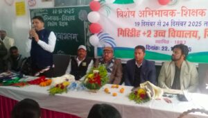 गिरिडीह प्लस टू उच्च विद्यालय में सोमवार को अभिभावक–शिक्षक संगोष्ठी (पीटीएम) का आयोजन किया गया। कार्यक्रम में मुख्य अतिथि के रूप में राज्यसभा सांसद डॉ. सरफराज अहमद तथा विशिष्ट अतिथि जिला शिक्षा पदाधिकारी वसीम अहमद उपस्थित रहे। विद्यालय के प्राचार्य दयानंद कुमार ने अतिथियों का स्वागत किया। दीप प्रज्वलन के साथ कार्यक्रम की शुरुआत हुई, जिसमें बड़ी संख्या में अभिभावकों की भागीदारी रही। इस दौरान विद्यार्थियों के शैक्षणिक प्रदर्शन, परीक्षा परिणाम और सरकारी योजनाओं की जानकारी अभिभावकों को दी गई।