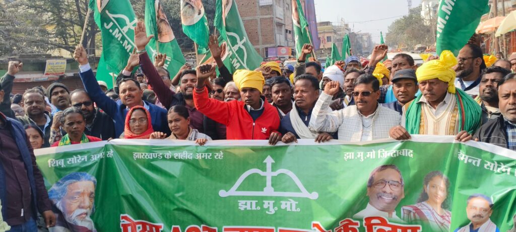 गिरिडीह में झारखंड सरकार द्वारा पेसा (पंचायत विस्तार अनुसूचित क्षेत्र) कानून लागू किए जाने के बाद शुक्रवार को झारखंड मुक्ति मोर्चा (झामुमो) की ओर से जोरदार जश्न मनाया गया। पार्टी कार्यालय से टावर चौक तक ढोल-नगाड़ों के साथ भव्य रैली निकाली गई, जिसमें बड़ी संख्या में झामुमो कार्यकर्ता शामिल हुए। हाथों में पार्टी झंडा लिए कार्यकर्ताओं ने नारेबाजी करते हुए मुख्यमंत्री हेमंत सोरेन और राज्य सरकार के प्रति आभार जताया। पूरा इलाका उत्साह और खुशी के माहौल में सराबोर नजर आया।