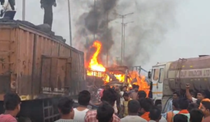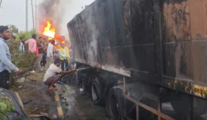 गिरिडीह जिले के डुमरी थाना क्षेत्र अंतर्गत कुलगो टोल प्लाजा के समीप गुरुवार की अहले सुबह एक भीषण सड़क हादसा हो गया। बताया जा रहा है कि बगोदर की ओर से आ रहा एक तेज रफ्तार गुड़ लदा ट्रक अनियंत्रित होकर सड़क किनारे खड़े ट्रकों से जा टकराया। टक्कर इतनी जबरदस्त थी कि एक के बाद एक तीन ट्रक आपस में भिड़ गए। टक्कर के तुरंत बाद तीनों ट्रकों में भीषण आग लग गई, जिसने देखते ही देखते विकराल रूप धारण कर लिया। आग की लपटें इतनी तेज थीं कि मौके पर मौजूद लोग कुछ समझ पाते, उससे पहले ही दो ट्रक पूरी तरह आग की चपेट में आ गए। इस दर्दनाक हादसे में गुड़ लदे ट्रक के चालक और उपचालक बाहर नहीं निकल सके और जिंदा जलकर उनकी मौके पर ही मौत हो गई।
